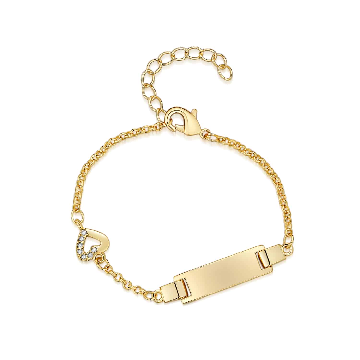 צמיד מצופה זהב עם טס לחריטה של שם בשילוב לבבות חצי משובץ