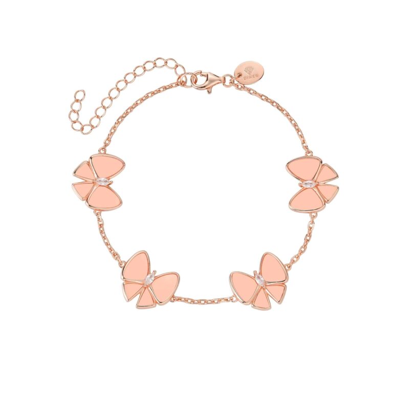 צמיד פרפרים ורודים משובצת באבני זירקון שקופות גימור עבודת יד כסף טהור.