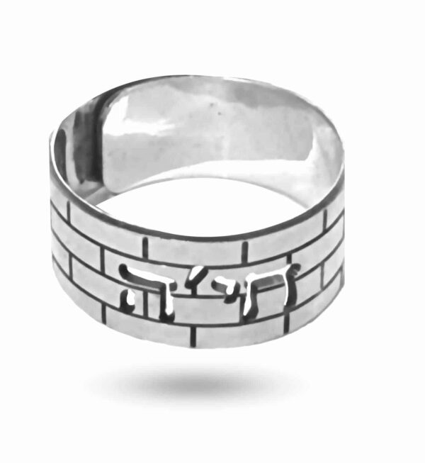 טבעת כסף עשויה בגימור עבודת יד טבול בזהב לבן בשילוב אבני הכותל עם שם חלול לבחירה אישית